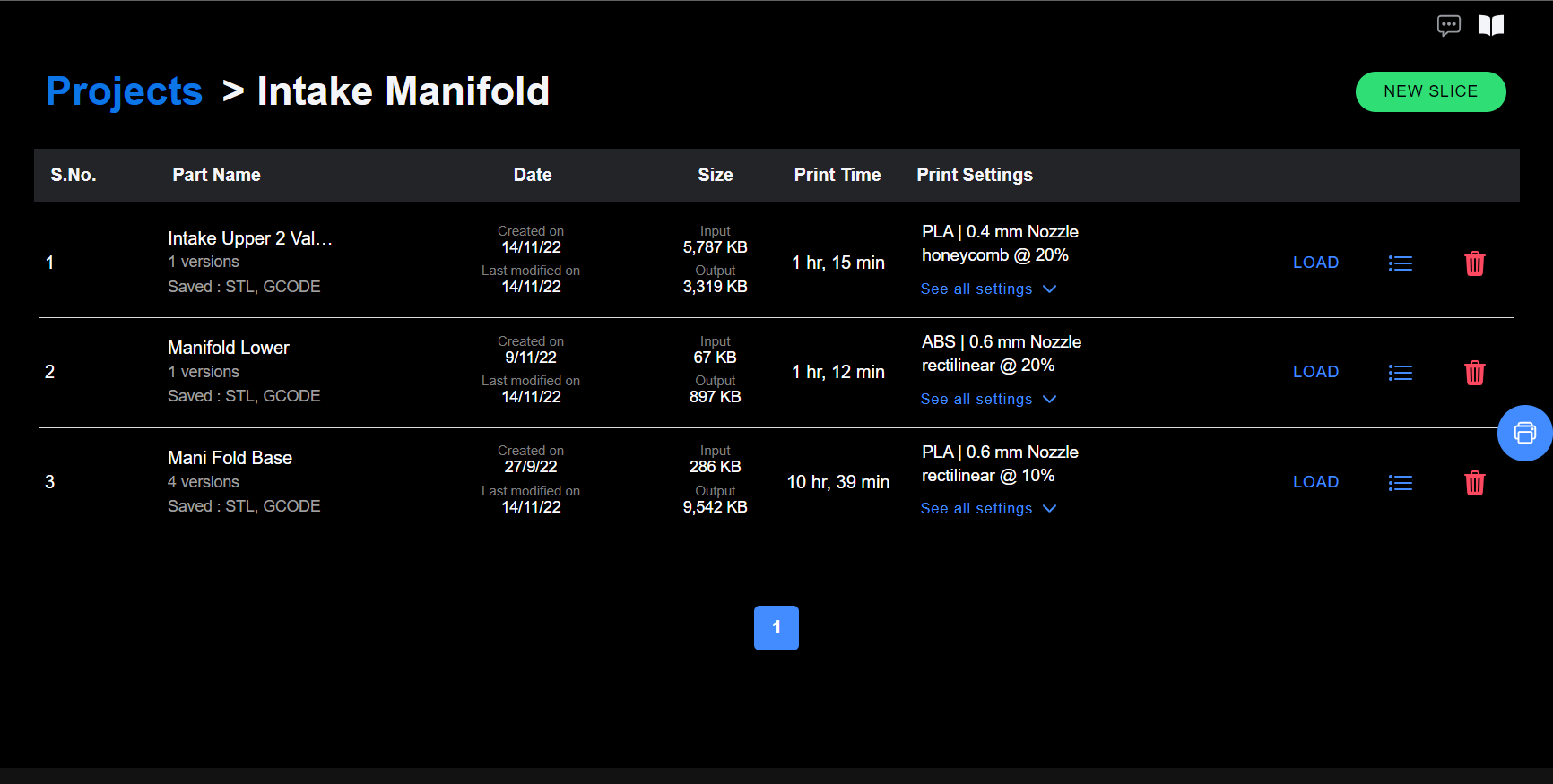 **Load** is a powerful feature that allows user to revisit a job, figure out what settings went wrong or right in the print, and make changes accordingly. Gone are the days when you have to slice everything again from the beginning and try to match a previously 3D printed part settings by approximation.