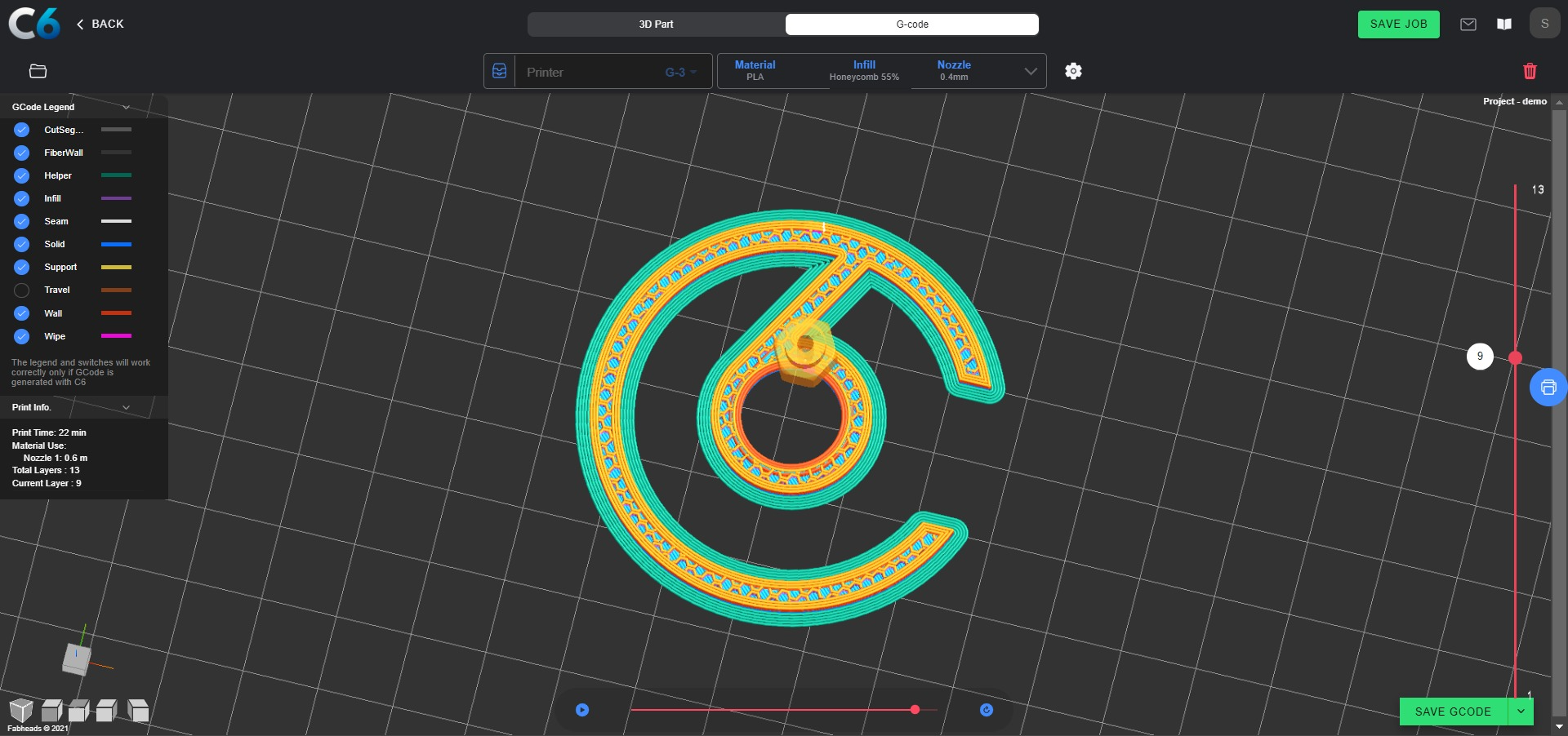 2. [**Preview Section**](https://docs.c6.fabheads.com/slicing-interface/preview) - This section receives the sliced/loaded g-code and user can visualize the g-code layer-by-layer, or playback each layer to see how the print will progress. User can visualize various parts of the g-code separately