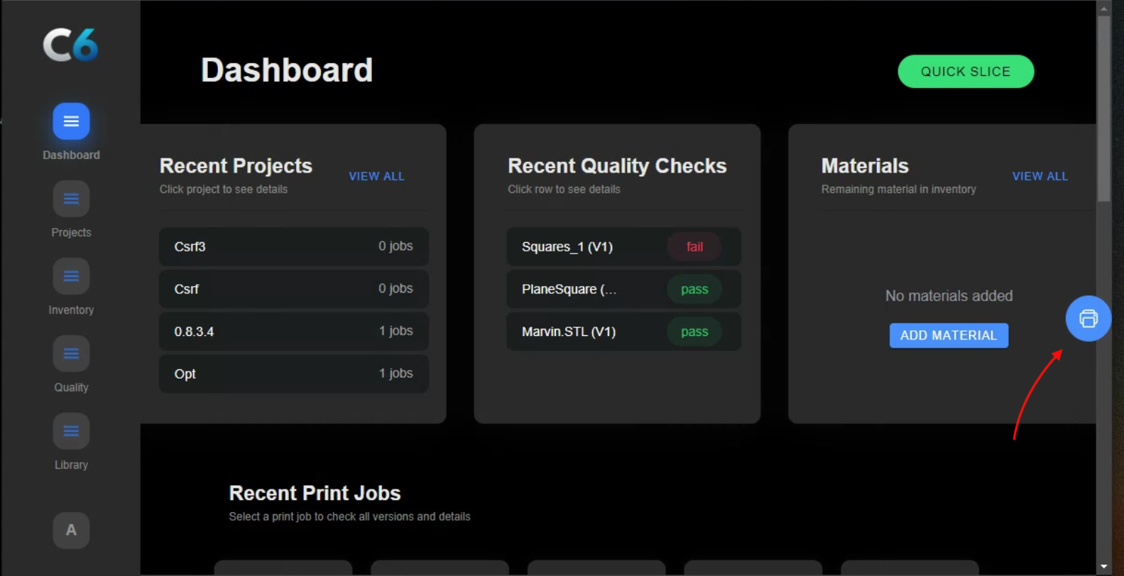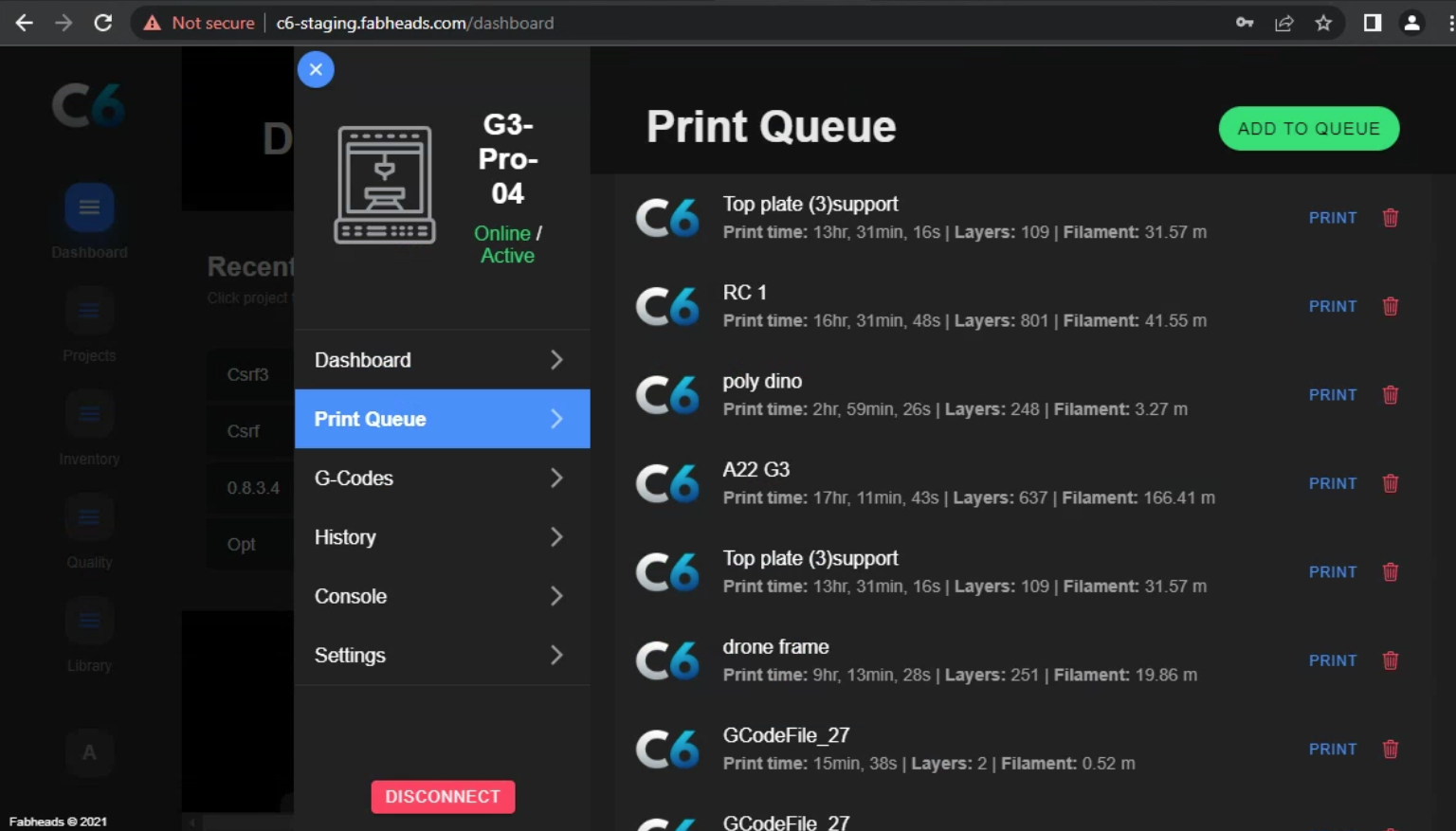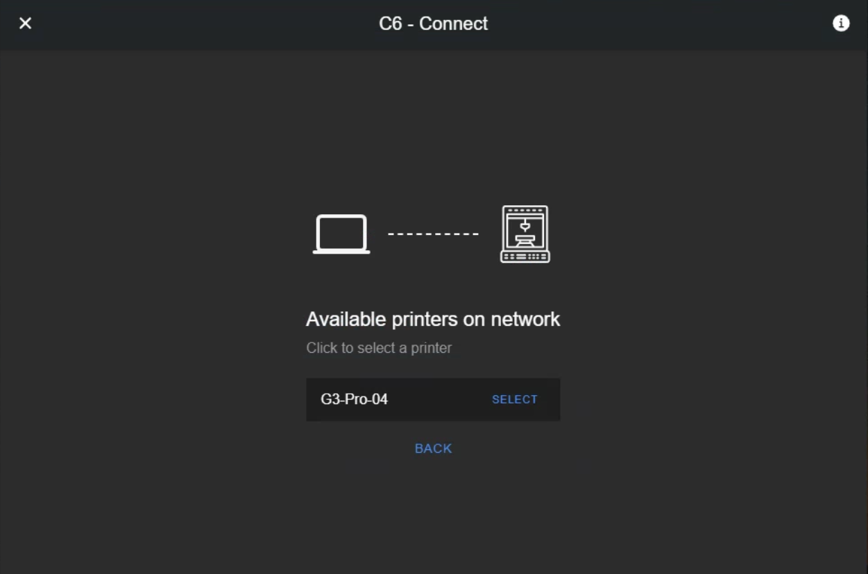 4\. Now you can access all printer features from right within C6. This includes getting access to g-codes from your projects, monitoring the material used etc.&#x20;