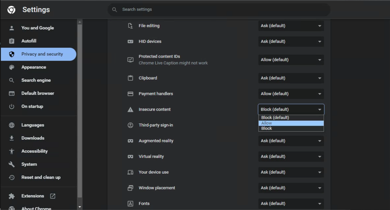 Find the **Insecure Content** setting, and select **Allow**, to allow HTTP content in the browser