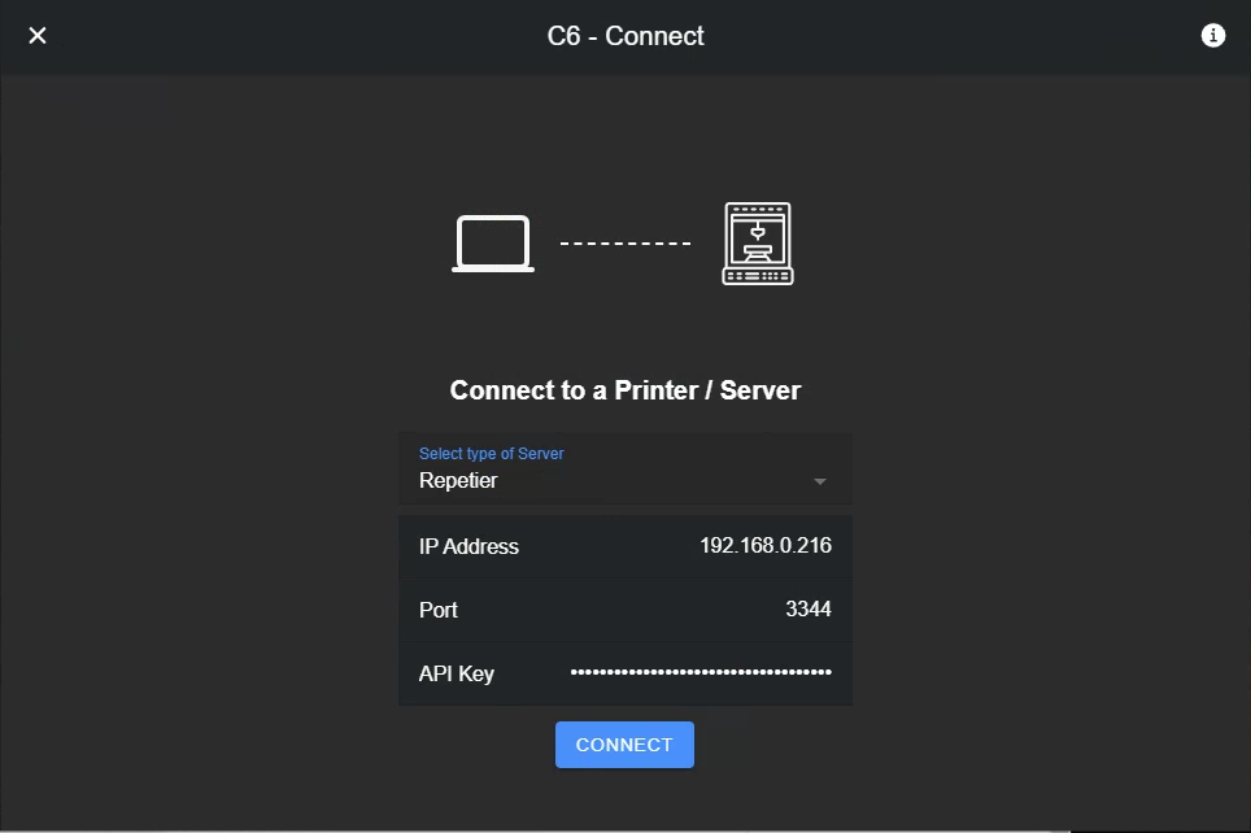 2\. In the connect module, enter your printer's IP, port number and API key and click **Connect** *(See* [*how to get Repetier Server API Key*](https://docs.c6.fabheads.com/faq#how-to-get-repetier-server-api-key)*)*